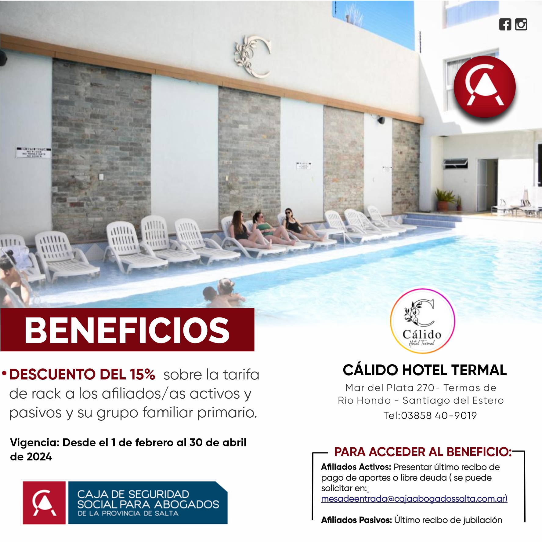 DESCUENTO DEL 15% sobre tarifa de rack a los afiliados/as activos y pasivos, y a su grupo familiar primario.