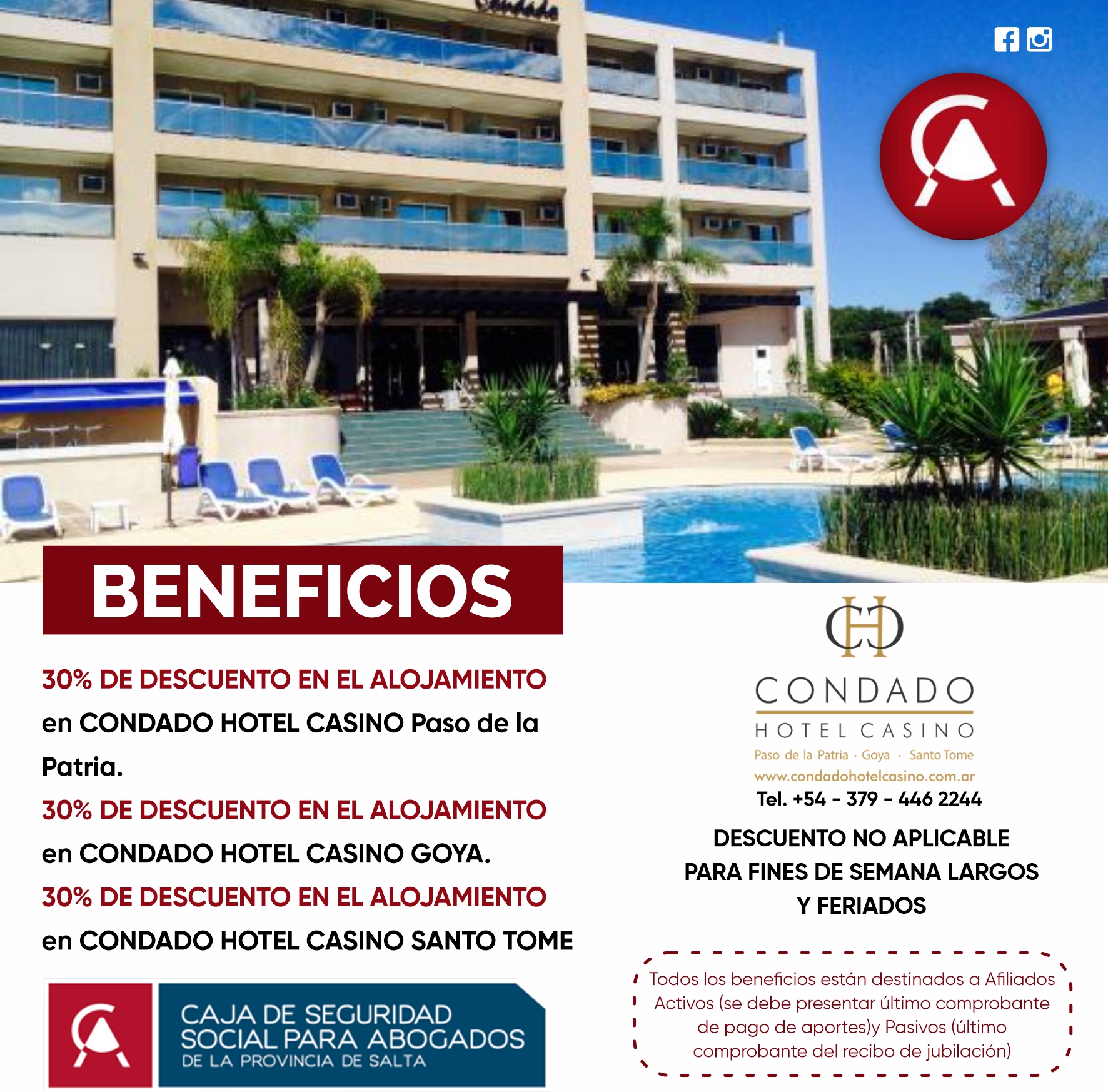 30 % DE DESCUEN EN EL ALOJAMIENTO en los hoteles Condado Casino de Paso de la Patria, de Santo Tome y de Goya Corrientes.