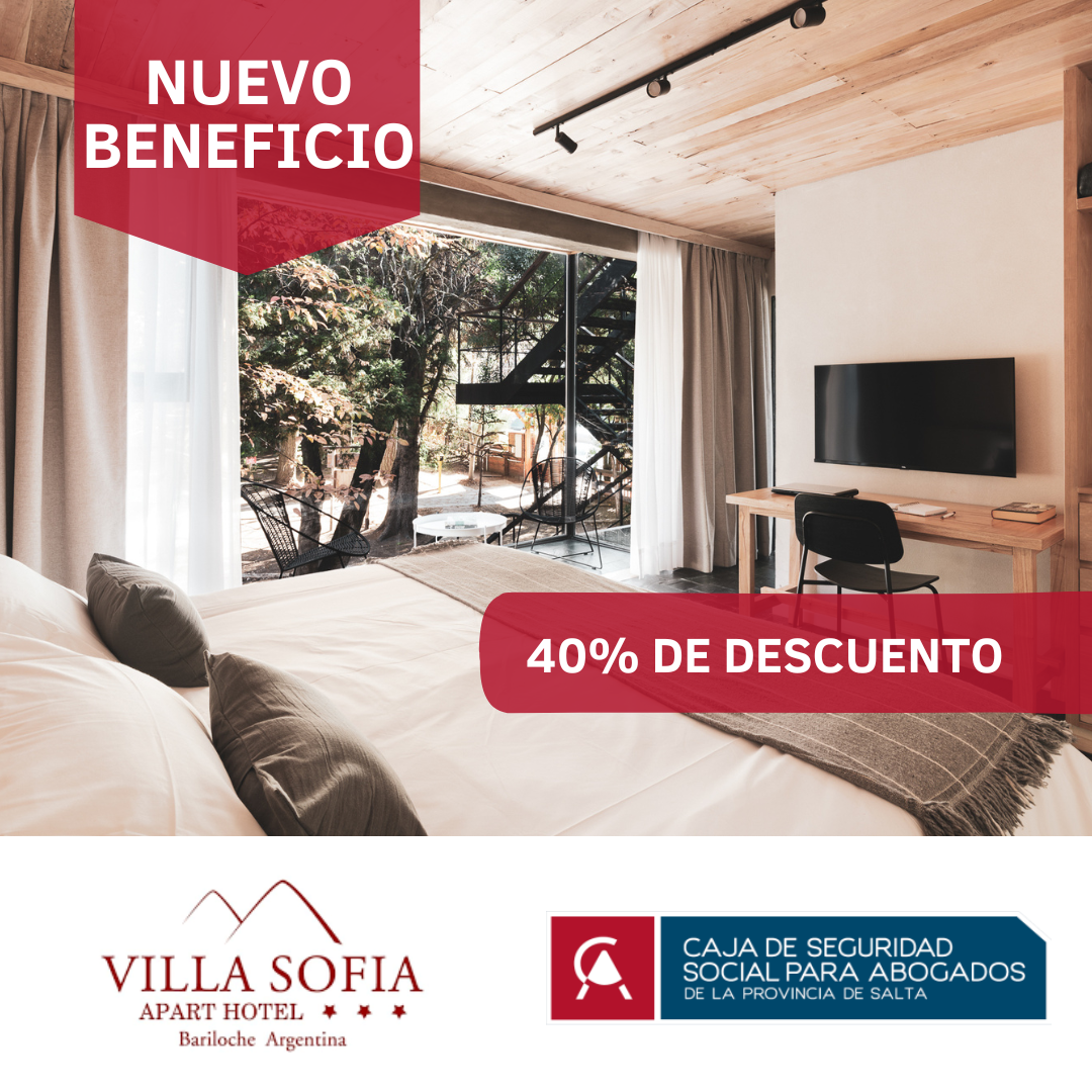 Informamos que en el Apart Villa Sofía de Bariloche entre el 1 y el 19 de diciembre hay un 40% de descuento hasta agotar la disponibilidad para los afiliados activos, jubilados y pensionados de la institución.