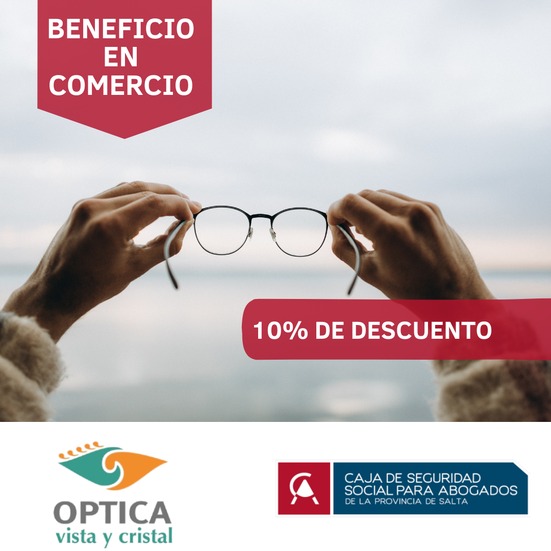 Desde la Caja de Seguridad Social para Abogados de la provincia de Salta firmamos un convenio de beneficios con Óptica Cristal en Tartagal, para el descuento del 10% para compras en efectivo, transferencia o débito sobre el precio final de anteojos y lentes de sol, además, de promociones con tarjetas de crédito de Banco Macro, en las condiciones que aquel estipule.