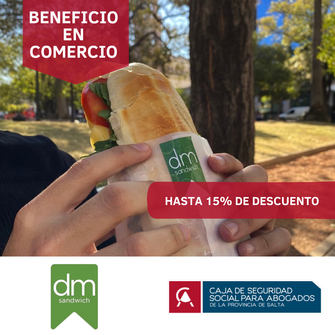 Desde la Caja de Seguridad Social para Abogados de la provincia de Salta firmamos un convenio de beneficios con DM Sándwich, para el descuento del 10% en sándwiches de miga por docena, 15% en productos sándwiches baguettes y calientes, 15% en sándwiches pebetes, todos estos productos con cualquiera de los rellenos disponibles.