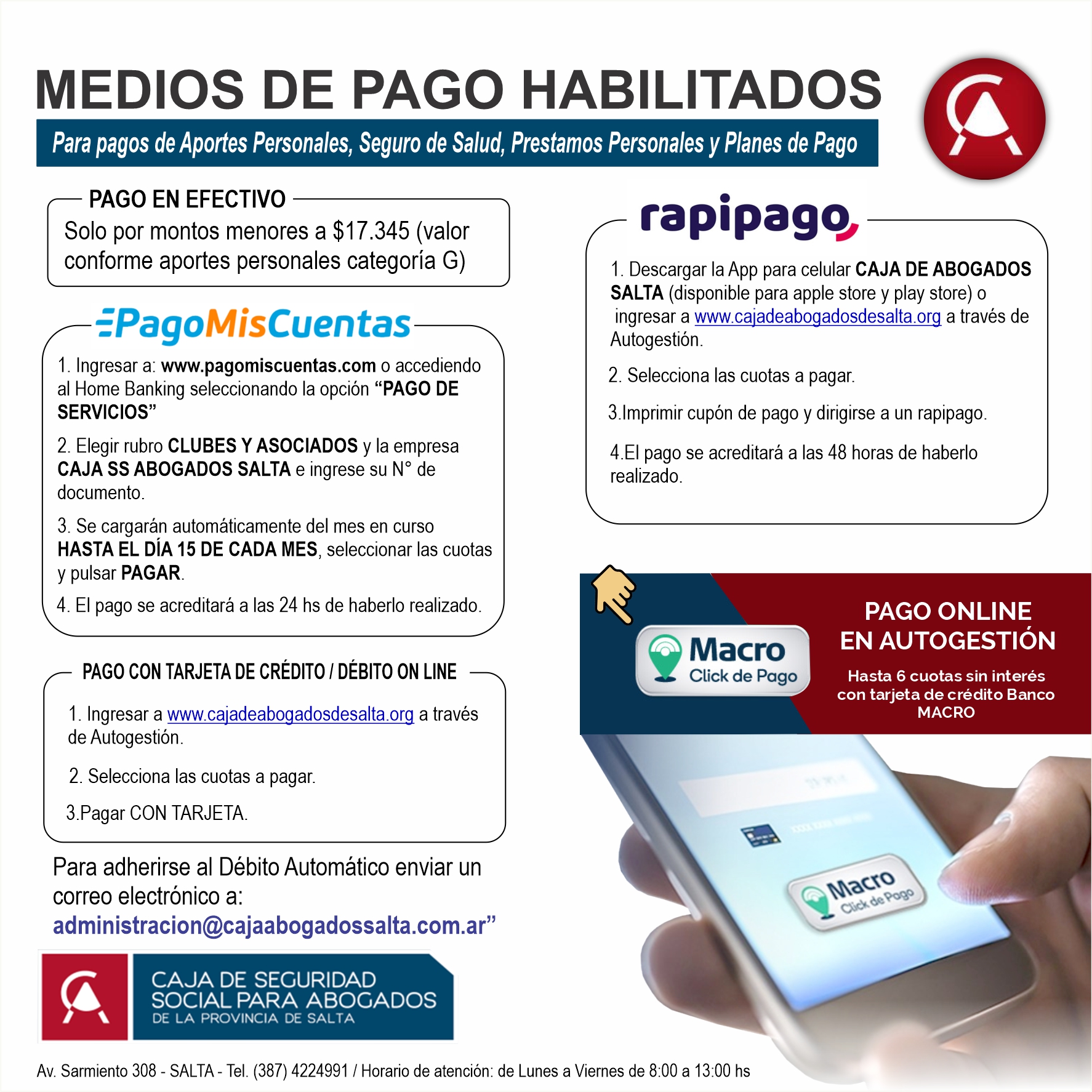 PAGO EFECTIVO: Sólo por montos menores a $17.345 (valor conforme a Aportes Personales Categoría G).