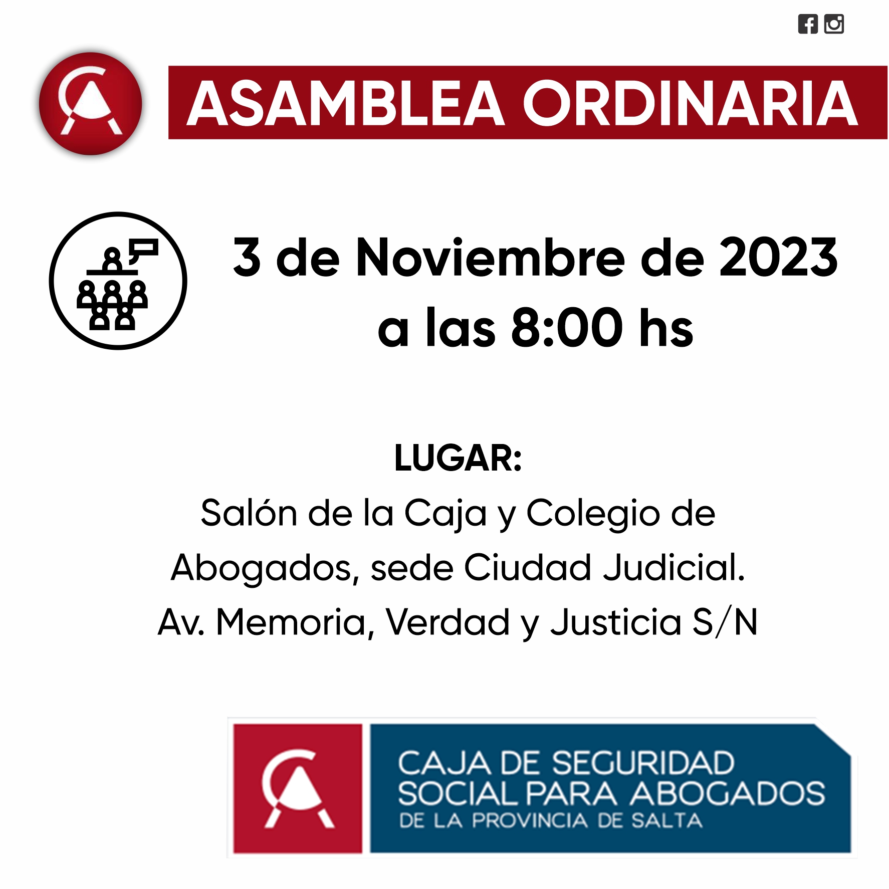Conforme lo publicado en el Boletin Oficial y Diario el Tribuno: El Consejo de Administración de la Caja de Seguridad Social para Abogados de la Provincia de Salta, informa que la Asamblea Ordinaria de Afiliados y Jubilados será el día 3 de Noviembre de 2.023 a las 08:00 horas, en el domicilio de la Institución, sito en Avenida Memoria, Verdad y Justicia S/Nº, Salón de la Caja y Colegio de Abogados Sede Ciudad Judicial, de la Ciudad de Salta Capital.