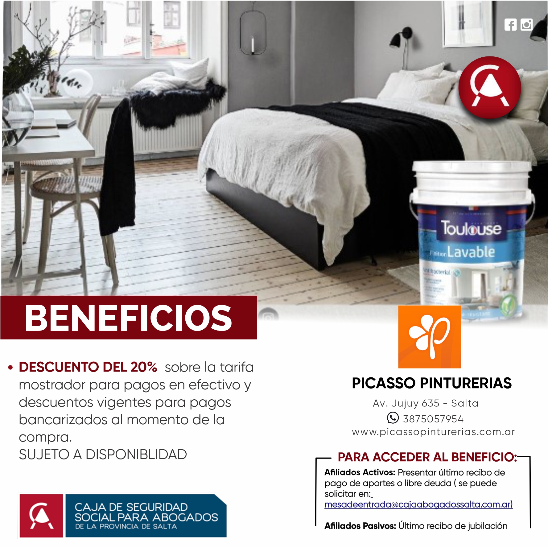 Pinturerias Picasso ofrece a los afiliados y afiliadas de la Caja de Abogados un descuento del 20% sobre compras vigentes en tarifa mostrador en pagos de contado efectivo.