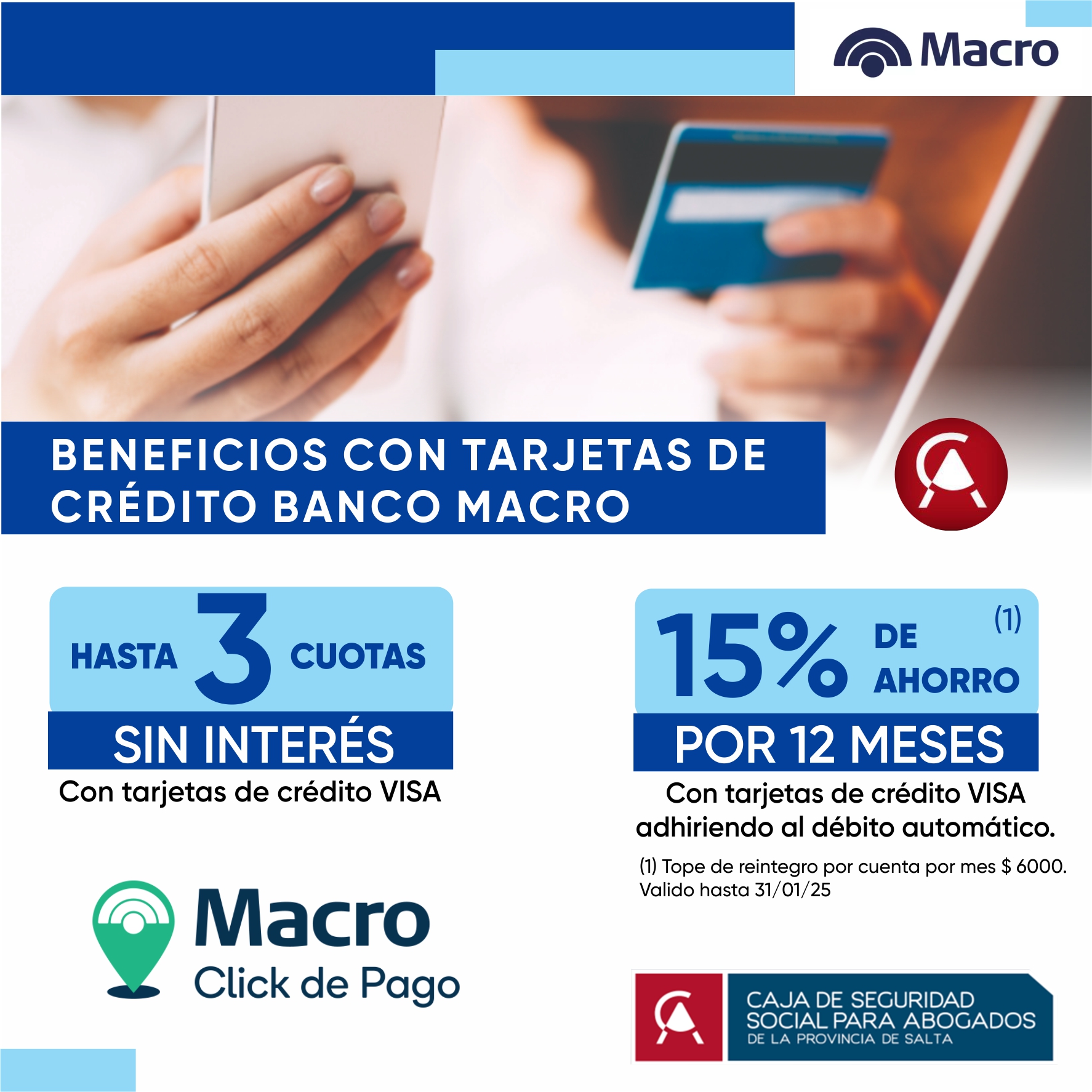 Renovamos el beneficio con tarjetas de crédito BANCO MACRO, para pagos de aportes previsionales, seguros y obra social.