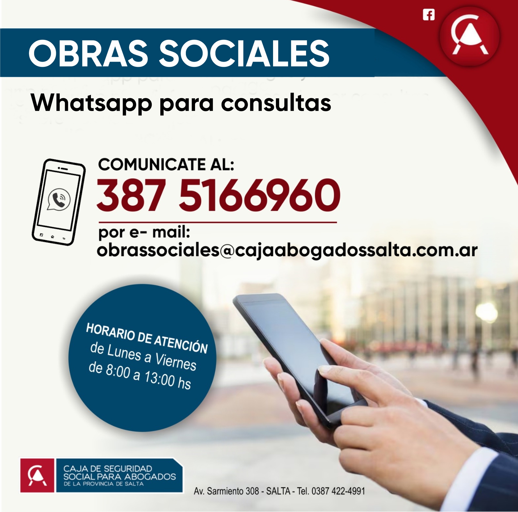 También podrán hacerlo a través de nuestra casilla de correo disponible: obrassociales@cajaabogadossalta.com.ar
