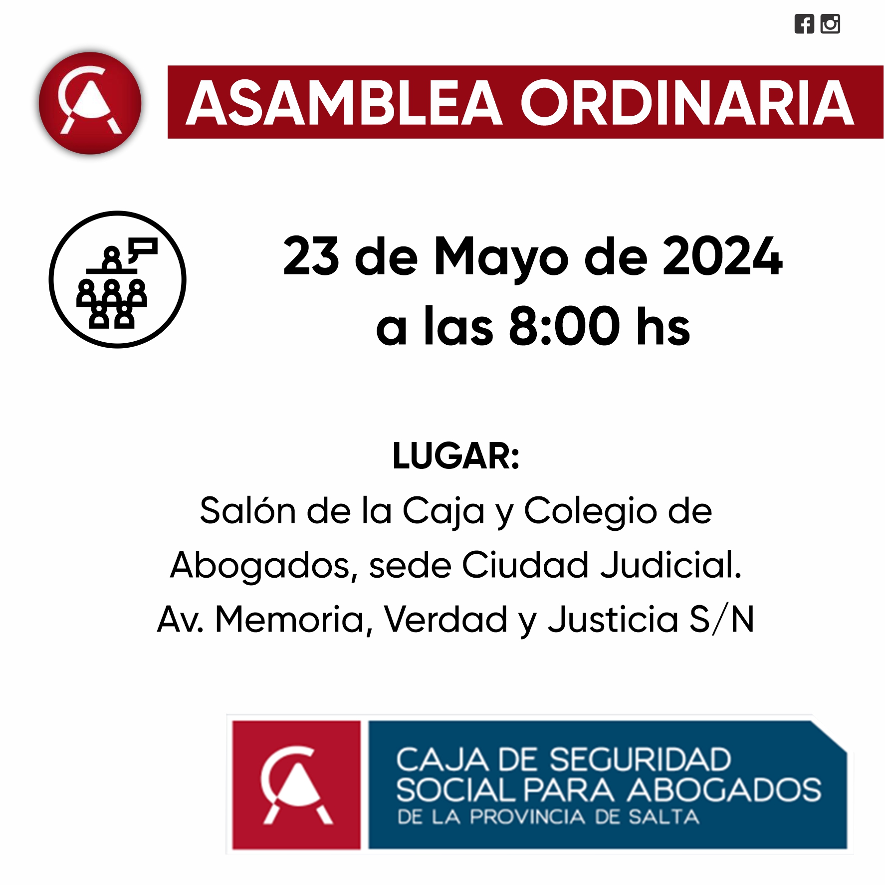 El Consejo de Administración de la Caja de Seguridad Social para abogados de la Provincia de Salta, convoca a la Asamble Ordinaria el día 23 DE MAYO DE 2024 a las 8:00 horas en el domiciluo de la Institución , sito en Av. Memoria, Verdad y Justicia S/N°, Salón de la Caja y Colegio de Abogados, Sede Ciudad Judicial de la Ciudad de Salta para tratar el siguiente: