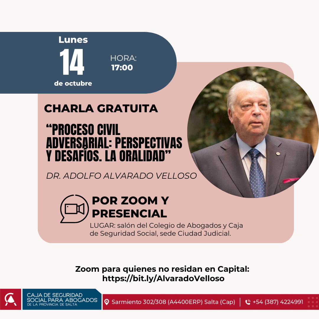 Este lunes 14 de octubre se firmará un convenio de cooperación académica y tecnológica entre la Caja de Seguridad Social para Abogados y la Fundación para el Desarrollo de las Ciencias Jurídicas. En el marco de esta firma, el prestigioso jurista Dr. Adolfo Alvarado Velloso, brindará una charla gratutia en Salta abierta para todo público.
