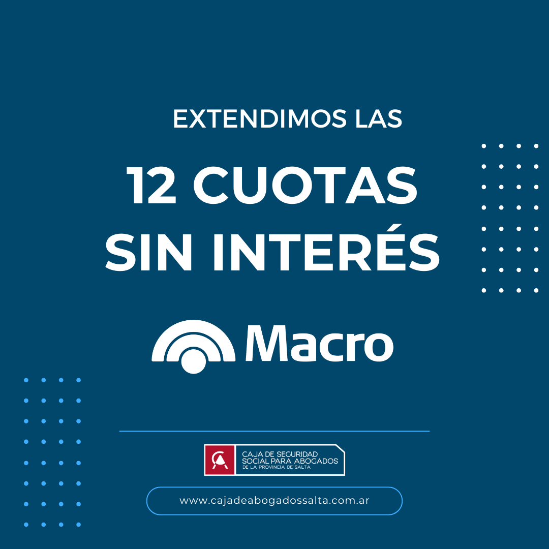 A pedido de los/as afiliados/as se extendieron las 12 cuotas sin interés pagando con VISA Banco Macro, después de gestiones desde la presidencia a cargo de la Dra. Julia Toyos. La extensión será hasta el próximo 28 de febrero del corriente año.