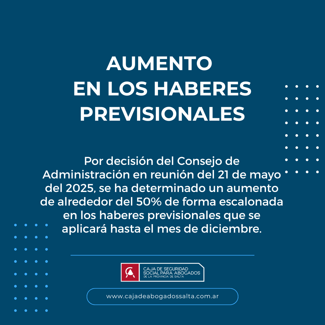 El Consejo de Administración de la Caja de Seguridad Social para Abogados de la Provincia de Salta resolvió, en sesión celebrada el pasado 21 de mayo, aprobar un nuevo esquema de incremento escalonado en los haberes previsionales en curso de pago, en atención a la necesidad de recomponer progresivamente el poder adquisitivo de los beneficios y garantizar una cobertura digna para sus beneficiarios.
